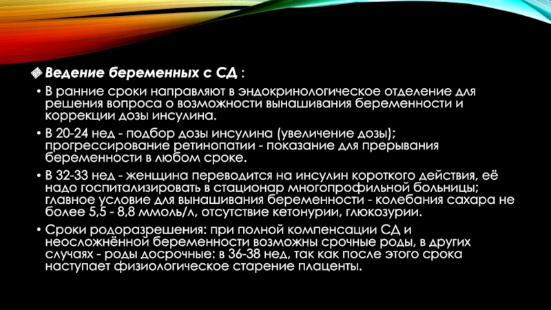 В 32-33 нед - женщина переводится на инсулин короткого действия, её надо госпитализировать в стационар многопрофильной больницы; главное условие для вынашивания беременности - колебания сахара не более 5,5 - 8,8 ммоль/л, отсутствие кетонурии, глюкозурии.