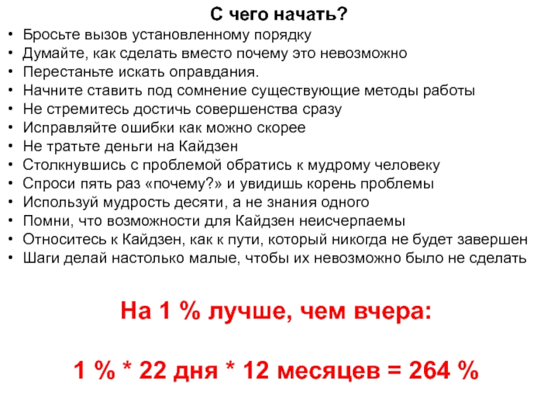 день KAIZEN Institute консультирует как производственные компании, так и компании, работающие в сфере услуг: банки, больницы, гостиницы, и даже государственные организации. Нет такой модели бизнеса, для которой не подходит Кайдзен.Этот метод используют выдающиеся компании: Toyota, Nissan, Canon, Honda, Komatsu, Matsushita и многие др.