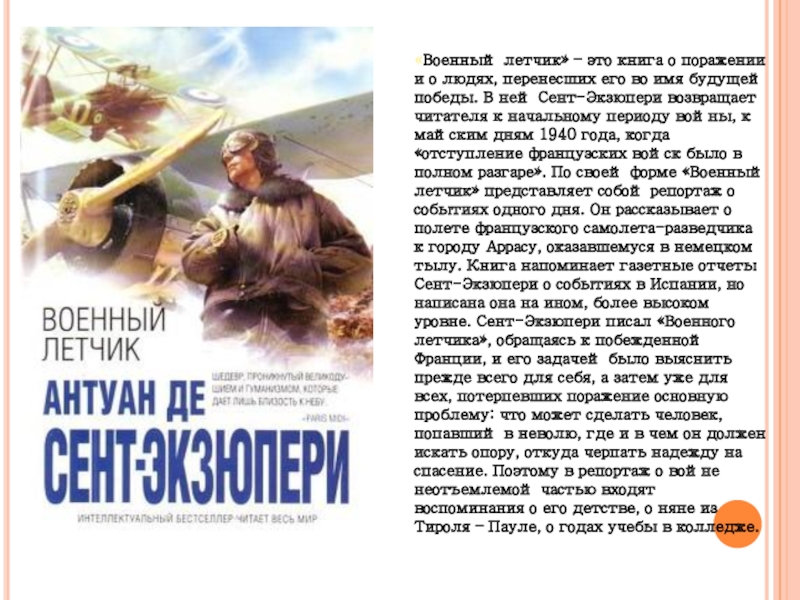 Слайд 5«Военный летчик» – это книга о поражении и о людях,