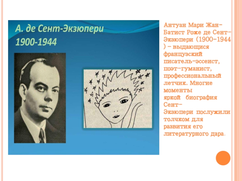 Антуан Мари Жан-Батист Роже де Сент-Экзюпери (1900-1944) – выдающися французский писатель-эссеист, поэт-гуманист, профессиональный летчик. Многие моменты яркой биография Сент-Экзюпери послужили