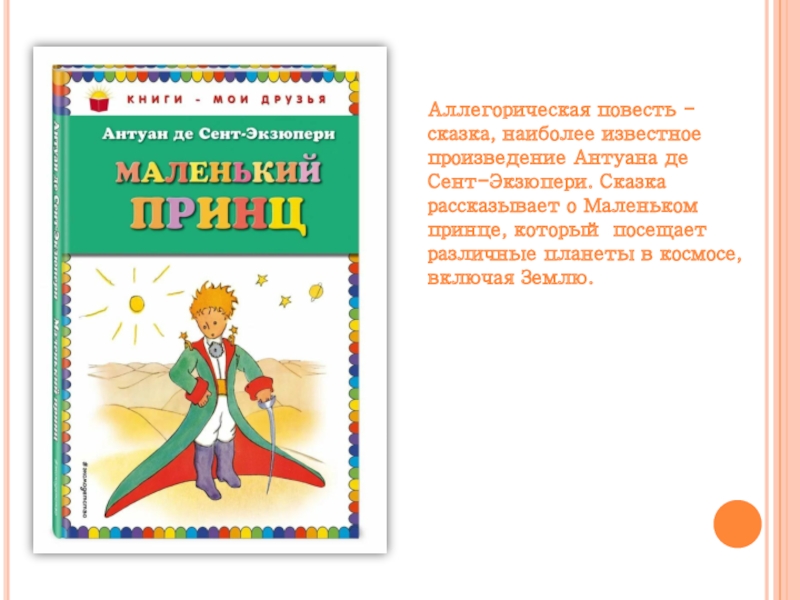 Аллегорическая повесть -сказка, наиболее известное произведение Антуана де Сент-Экзюпери. Сказка рассказывает о Маленьком принце, который посещает различные