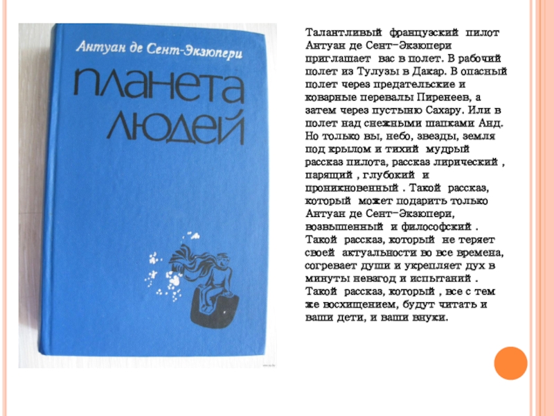 через предательские и коварные перевалы Пиренеев, а затем через пустыню Сахару. Или в полет над снежными шапками Анд. Но только вы, небо, звезды, земля под крылом и тихий мудрый рассказ пилота, рассказ лирический, парящий, глубокий и проникновенный. Такой рассказ, который может подарить только Антуан де Сент-Экзюпери, возвышенный и философский. Такой рассказ, который не теряет своей актуальности во все времена, согревает души и укрепляет дух в минуты невзгод и испытаний. Такой рассказ, который, все с тем же восхищением, будут читать и ваши дети, и ваши внуки.