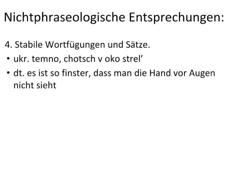 Nichtphraseologische Entsprechungen:4. Stabile Wortfügungen und Sätze.ukr. temno, chotsch v oko strel’dt. es ist so finster, dass man