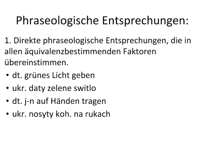 Phraseologische Entsprechungen:1. Direkte phraseologische Entsprechungen, die in allen äquivalenzbestimmenden Faktoren übereinstimmen.dt. grünes Licht gebenukr. daty zelene switlodt.