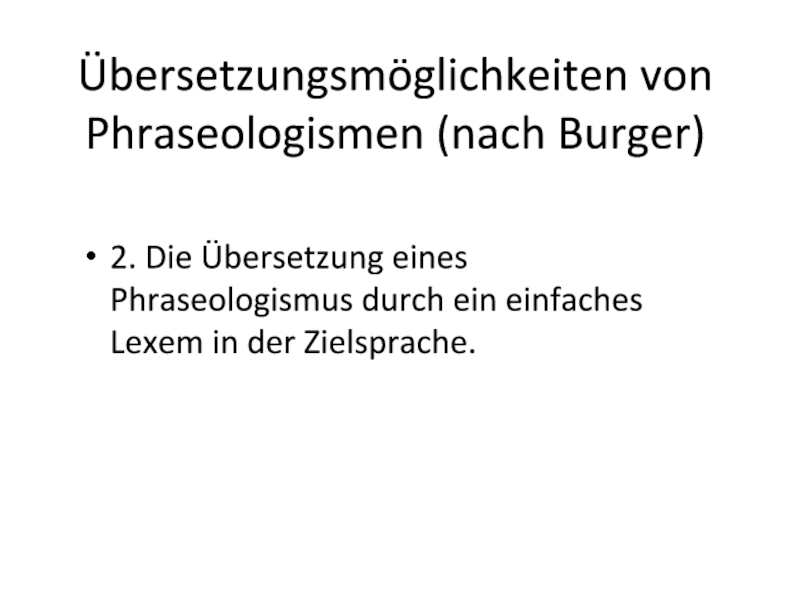 Übersetzungsmöglichkeiten von Phraseologismen (nach Burger)2. Die Übersetzung eines Phraseologismus durch ein einfaches Lexem in der Zielsprache.