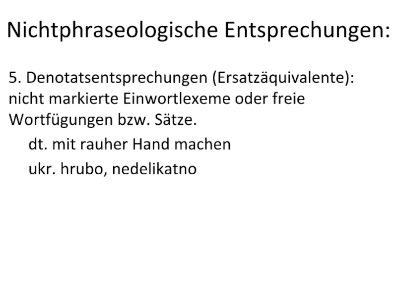 Nichtphraseologische Entsprechungen:5. Denotatsentsprechungen (Ersatzäquivalente): nicht markierte Einwortlexeme oder freie Wortfügungen bzw. Sätze.	dt. mit rauher Hand machen	ukr. hrubo,