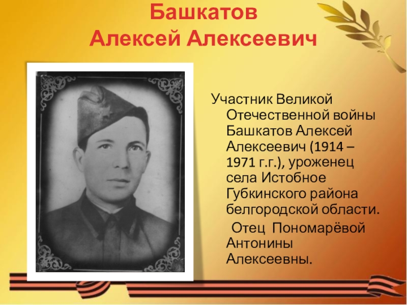 Участник Великой Отечественной войны Башкатов Алексей Алексеевич (1914 –