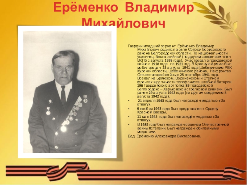 Гвардии младший сержант Ерёменко Владимир Михайлович родился в