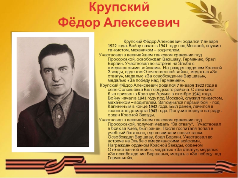 Крупский Фёдор Алексеевич родился 7 января 1922 года в селе Соловьёвка Белгородского района. С этих мест был призван в Красную Армию в октябре 1941 года. Войну начал в 1941 году под Москвой, служил танкистом, механиком – водителем. Запомнился первый бой - под Калининым в конце 1942 года. Был ранен, лечился в госпитале до марта 1943 года. Получил первую награду - орден Красной Звезды.