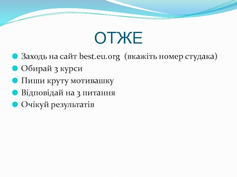 ОТЖЕЗаходь на сайт best.eu.org (вкажіть номер студака)Обирай 3 курсиПиши круту мотивашкуВідповідай на 3 питанняОчікуй результатів