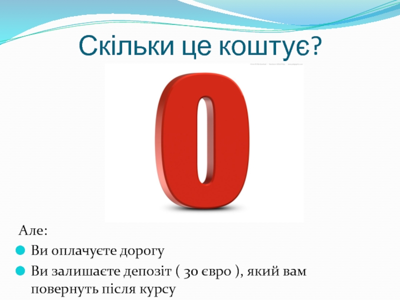 Скільки це коштує?Але:Ви оплачуєте дорогуВи залишаєте депозіт ( 30 євро ), який вам повернуть після курсу