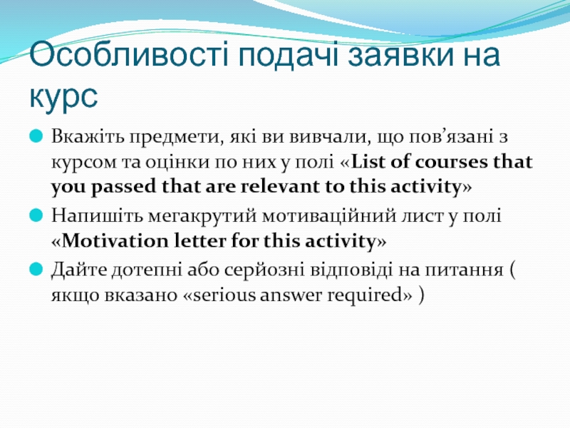 Особливості подачі заявки на курсВкажіть предмети, які ви вивчали, що пов’язані з курсом та оцінки по них