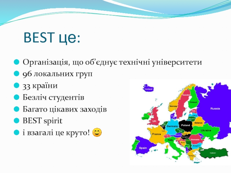 BEST це:Організація, що об’єднує технічні університети96 локальних груп33 країниБезліч студентівБагато цікавих заходівBEST spiritі взагалі це круто! 