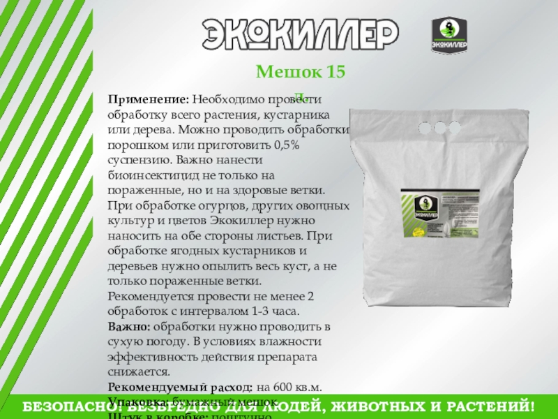обработки порошком или приготовить 0,5% суспензию. Важно нанести биоинсектицид не только на пораженные, но и на здоровые ветки. При обработке огурцов, других овощных культур и цветов Экокиллер нужно наносить на обе стороны листьев. При обработке ягодных кустарников и деревьев нужно опылить весь куст, а не только пораженные ветки.