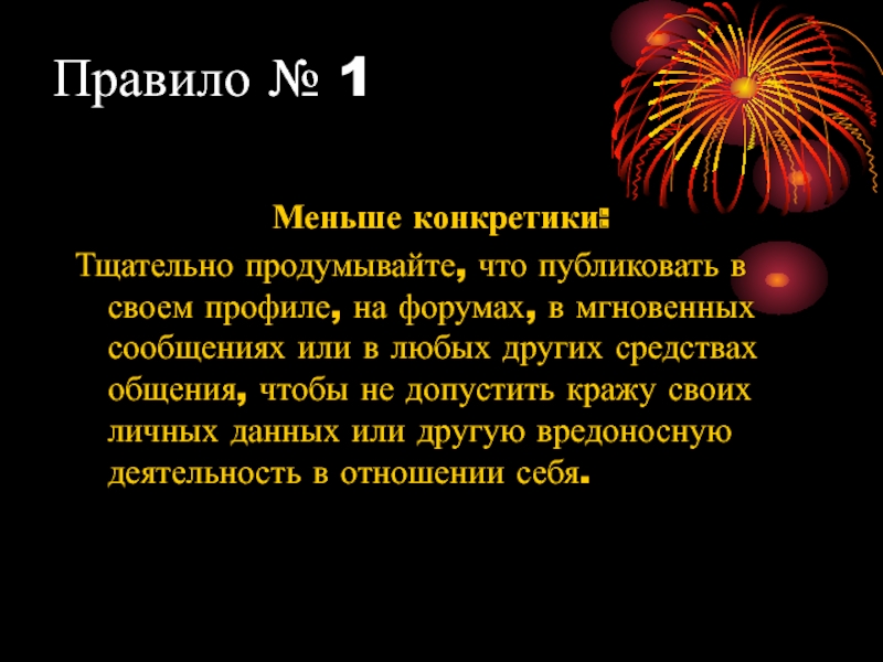 Правило № 1Меньше конкретики:Тщательно продумывайте, что публиковать в своем профиле, на форумах, в мгновенных сообщениях или в любых других средствах общения, чтобы не допустить кражу своих личных данных или другую вредоносную