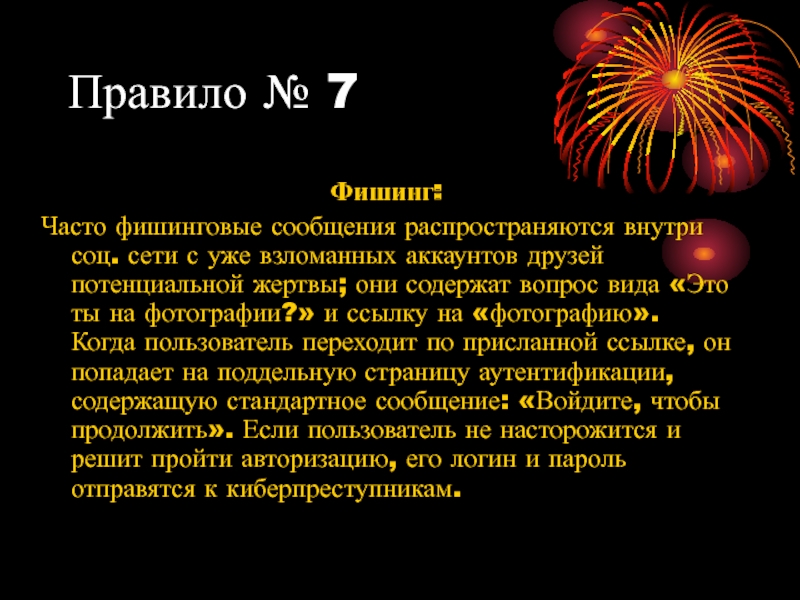 Правило № 7Фишинг:Часто фишинговые сообщения распространяются внутри соц. сети с уже взломанных аккаунтов друзей потенциальной жертвы; они