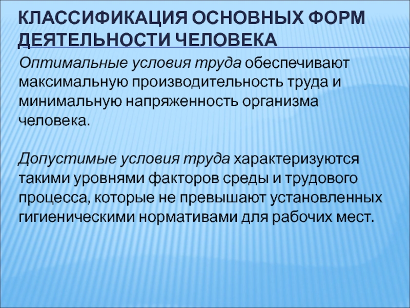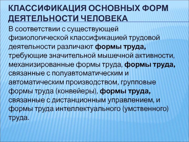 Слайд 95КЛАССИФИКАЦИЯ ОСНОВНЫХ ФОРМ ДЕЯТЕЛЬНОСТИ ЧЕЛОВЕКА