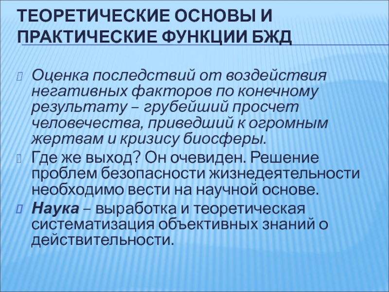 Где же выход? Он очевиден. Решение проблем безопасности жизнедеятельности необходимо вести на научной основе.