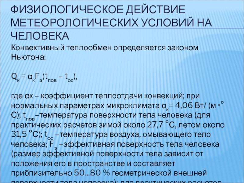 нормальных параметрах микроклимата αк= 4,06 Вт/ (м •°С); tпов–температура поверхности тела человека (для практических расчетов зимой около 27,7 °С, летом около 31,5 °С); tос –температура воздуха, омывающего тело человека; Fэ –эффективная поверхность тела человека (размер эффективной поверхности тела зависит от положения его в пространстве и составляет приблизительно 50...80 % геометрической внешней поверхности тела человека); для практических расчетов Fэ= 1,8 м2.