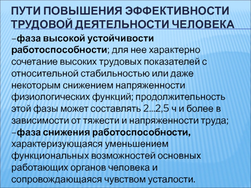 даже некоторым снижением напряженности физиологических функций; продолжительность этой фазы может составлять 2...2,5 ч и более в зависимости от тяжести и напряженности труда;