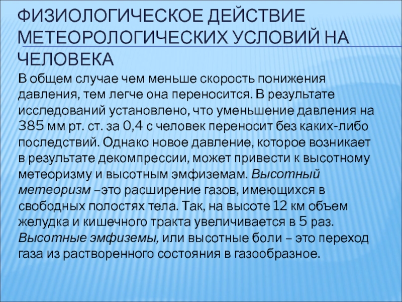 установлено, что уменьшение давления на 385 мм рт. ст. за 0,4 с человек переносит без каких-либо последствий. Однако новое давление, которое возникает в результате декомпрессии, может привести к высотному метеоризму и высотным эмфиземам. Высотный метеоризм –это расширение газов, имеющихся в свободных полостях тела. Так, на высоте 12 км объем желудка и кишечного тракта увеличивается в 5 раз. Высотные эмфиземы, или высотные боли – это переход газа из растворенного состояния в газообразное.