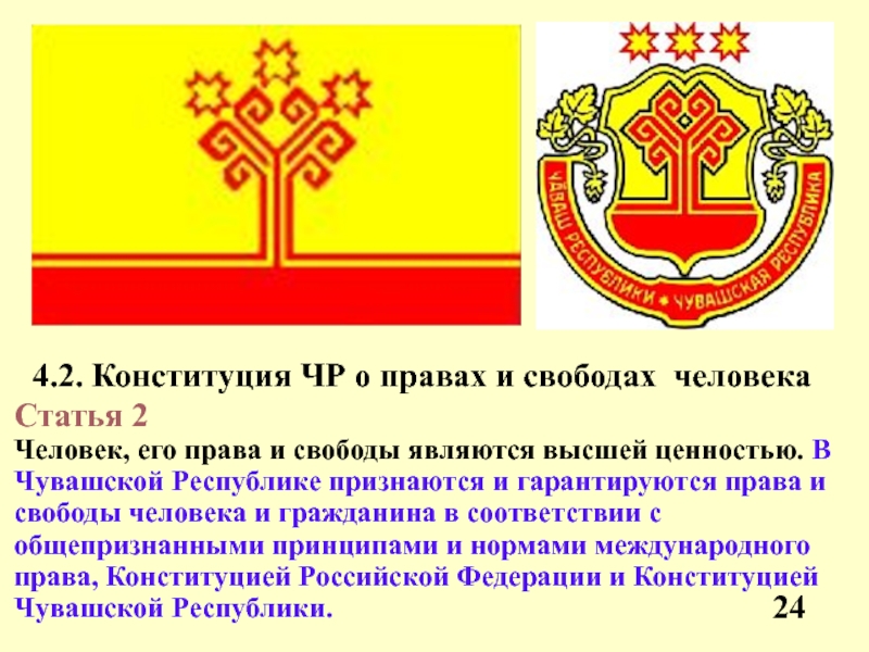 Человек, его права и свободы являются высшей ценностью. В Чувашской Республике признаются и гарантируются права и свободы человека и гражданина в соответствии с общепризнанными принципами и нормами международного права, Конституцией Российской Федерации и Конституцией Чувашской Республики.