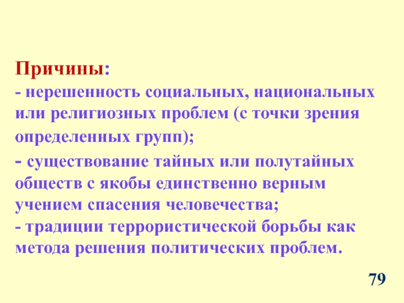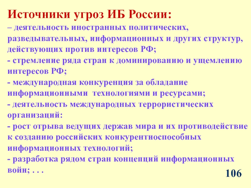 – деятельность иностранных политических, разведывательных, информационных и других структур, действующих против интересов РФ; - стремление ряда стран к доминированию и ущемлению интересов РФ; - международная конкуренция за обладание информационными технологиями и ресурсами; - деятельность международных террористических организаций: - рост отрыва ведущих держав мира и их противодействие к созданию российских конкурентноспособных информационных технологий; - разработка рядом стран концепций информационных войн; . . .