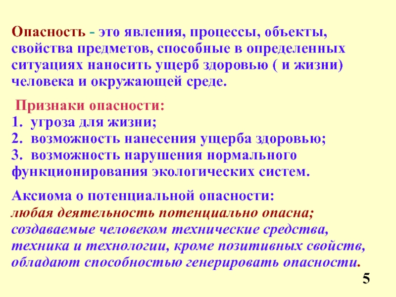 Слайд 5Опасность - это явления, процессы, объекты, свойства предметов, способные в