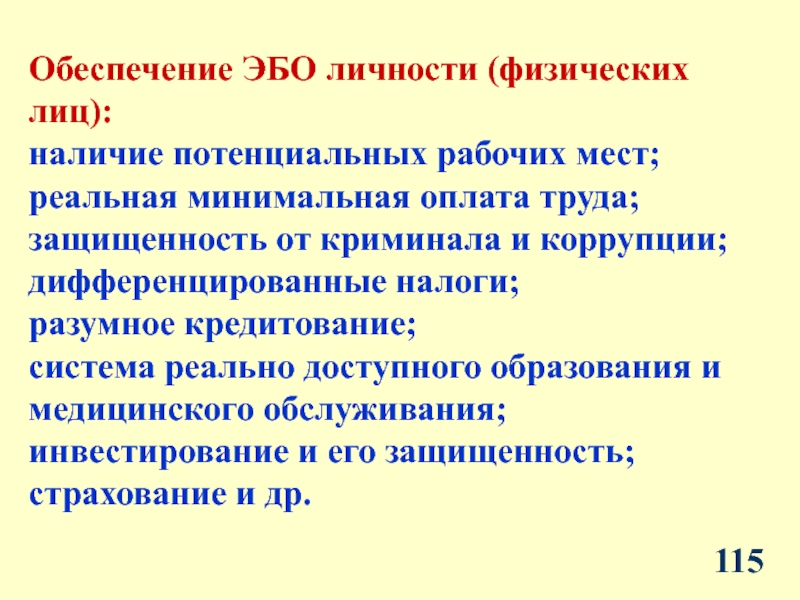 наличие потенциальных рабочих мест; реальная минимальная оплата труда; защищенность от криминала и коррупции; дифференцированные налоги; разумное кредитование; система реально доступного образования и медицинского обслуживания; инвестирование и его защищенность; страхование и др.