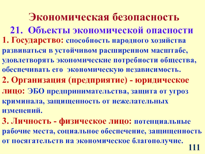 2. Организация (предприятие) - юридическое лицо: ЭБО предпринимательства, защита от угроз криминала, защищенность от нежелательных изменений. 3. Личность - физическое лицо: потенциальные рабочие места, социальное обеспечение, защищенность от посягательств на экономическое благополучие.