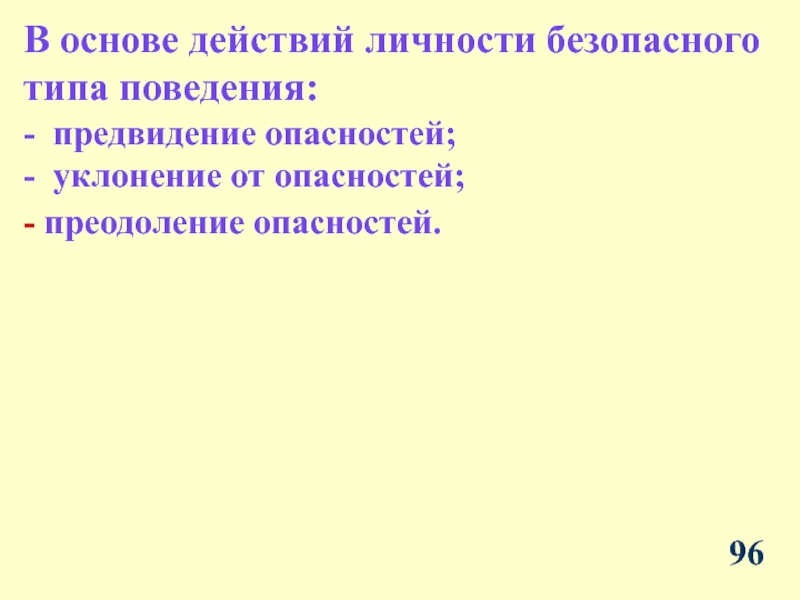 - предвидение опасностей; - уклонение от опасностей; - преодоление опасностей.
