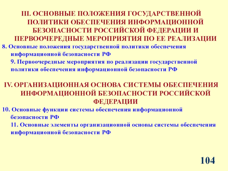 III. ОСНОВНЫЕ ПОЛОЖЕНИЯ ГОСУДАРСТВЕННОЙ ПОЛИТИКИ ОБЕСПЕЧЕНИЯ ИНФОРМАЦИОННОЙ БЕЗОПАСНОСТИ РОССИЙСКОЙ ФЕДЕРАЦИИ