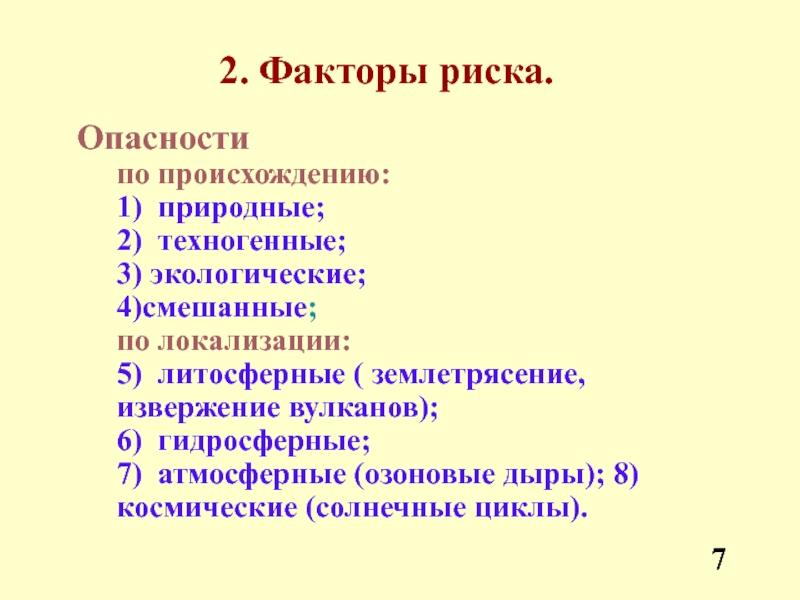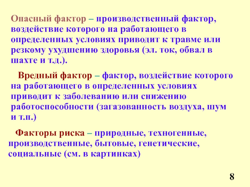 Факторы риска – природные, техногенные, производственные, бытовые, генетические, социальные (см. в картинках)
