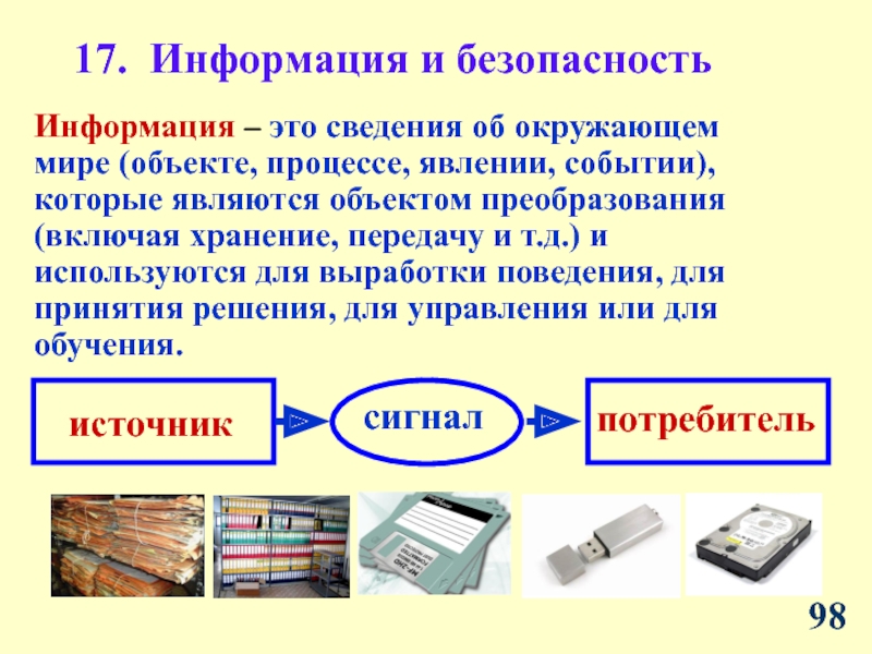 Слайд 98Информация – это сведения об окружающем мире (объекте, процессе, явлении,