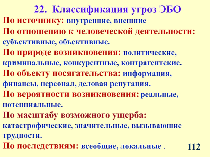 отношению к человеческой деятельности: субъективные, объективные. По природе возникновения: политические, криминальные, конкурентные, контрагентские. По объекту посягательства: информация, финансы, персонал, деловая репутация. По вероятности возникновения: реальные, потенциальные. По масштабу возможного ущерба: катастрофические, значительные, вызывающие трудности. По последствиям: всеобщие, локальные .