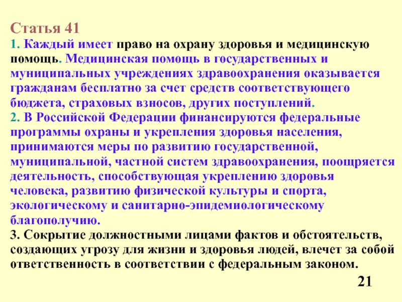 1. Каждый имеет право на охрану здоровья и медицинскую помощь. Медицинская помощь в государственных и муниципальных учреждениях здравоохранения оказывается гражданам бесплатно за счет средств соответствующего бюджета, страховых взносов, других поступлений. 2. В Российской Федерации финансируются федеральные программы охраны и укрепления здоровья населения, принимаются меры по развитию государственной, муниципальной, частной систем здравоохранения, поощряется деятельность, способствующая укреплению здоровья человека, развитию физической культуры и спорта, экологическому и санитарно-эпидемиологическому благополучию. 3. Сокрытие должностными лицами фактов и обстоятельств, создающих угрозу для жизни и здоровья людей, влечет за собой ответственность в соответствии с федеральным законом.