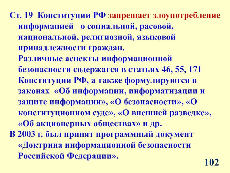 Слайд 102Ст. 19 Конституции РФ запрещает злоупотребление информацией о социальной,