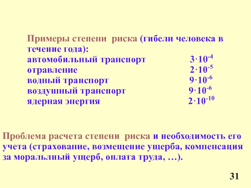 автомобильный транспорт 3·10-4 отравление 2·10-5 водный транспорт 9·10-6 воздушный транспорт 9·10-6 ядерная энергия 2·10-10