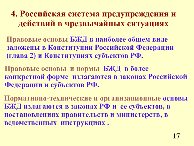 Правовые основы и нормы БЖД в более конкретной форме излагаются в законах Российской Федерации и субъектов РФ.