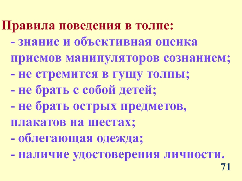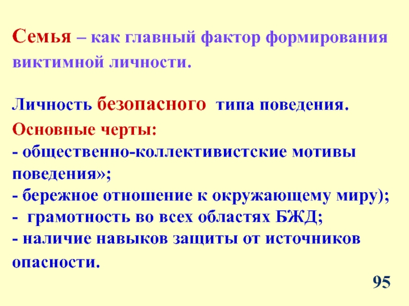 Личность безопасного типа поведения. Основные черты: - общественно-коллективистские мотивы поведения»; - бережное отношение к окружающему миру); - грамотность во всех областях БЖД; - наличие навыков защиты от источников опасности.