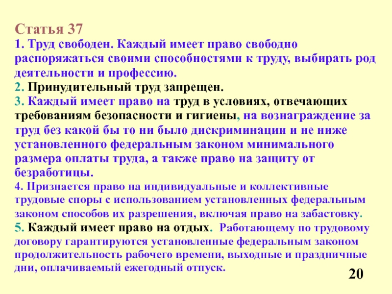 1. Труд свободен. Каждый имеет право свободно распоряжаться своими способностями к труду, выбирать род деятельности и профессию. 2. Принудительный труд запрещен. 3. Каждый имеет право на труд в условиях, отвечающих требованиям безопасности и гигиены, на вознаграждение за труд без какой бы то ни было дискриминации и не ниже установленного федеральным законом минимального размера оплаты труда, а также право на защиту от безработицы. 4. Признается право на индивидуальные и коллективные трудовые споры с использованием установленных федеральным законом способов их разрешения, включая право на забастовку. 5. Каждый имеет право на отдых. Работающему по трудовому договору гарантируются установленные федеральным законом продолжительность рабочего времени, выходные и праздничные дни, оплачиваемый ежегодный отпуск.