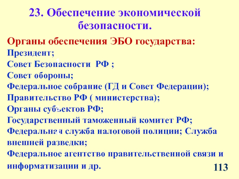 Слайд 113Органы обеспечения ЭБО государства: Президент;