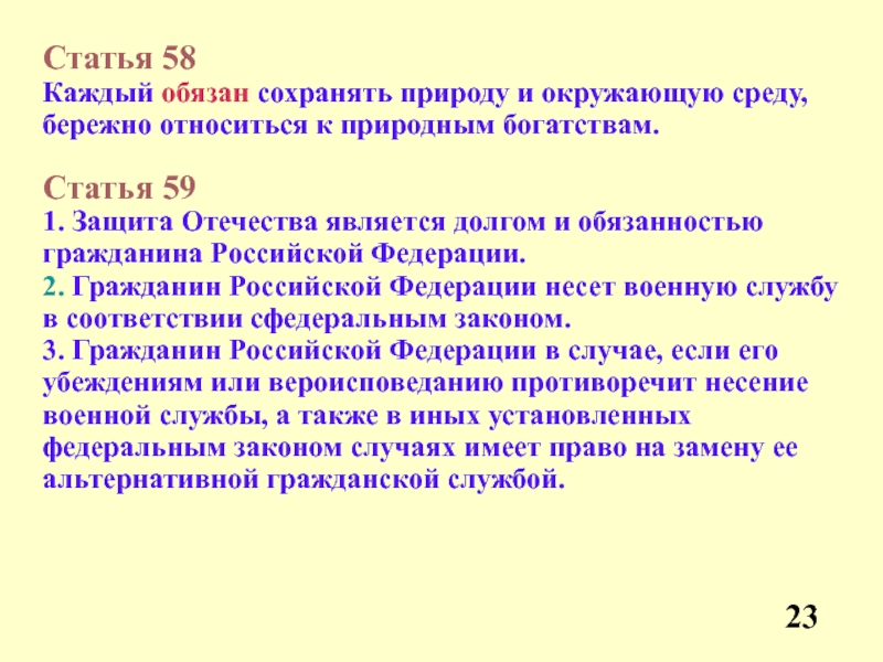 Статья 59 1. Защита Отечества является долгом и обязанностью гражданина Российской Федерации. 2. Гражданин Российской Федерации несет военную службу в соответствии сфедеральным законом. 3. Гражданин Российской Федерации в случае, если его убеждениям или вероисповеданию противоречит несение военной службы, а также в иных установленных федеральным законом случаях имеет право на замену ее альтернативной гражданской службой.