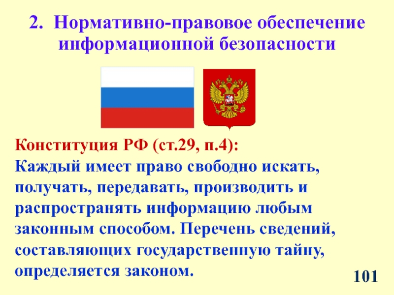Каждый имеет право свободно искать, получать, передавать, производить и распространять информацию любым законным способом. Перечень сведений, составляющих государственную тайну, определяется законом.