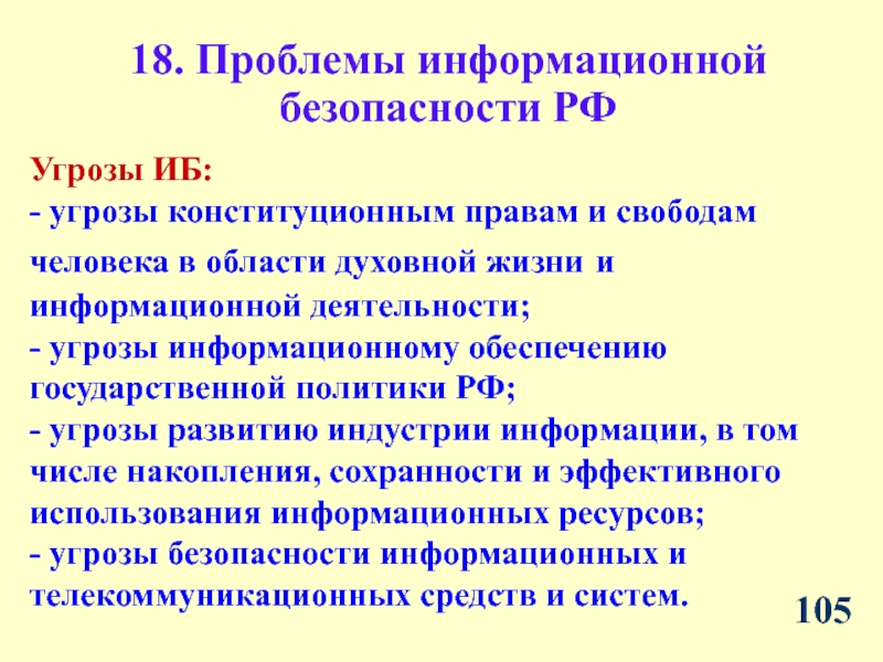 - угрозы конституционным правам и свободам человека в области духовной жизни и информационной деятельности; - угрозы информационному обеспечению государственной политики РФ; - угрозы развитию индустрии информации, в том числе накопления, сохранности и эффективного использования информационных ресурсов; - угрозы безопасности информационных и телекоммуникационных средств и систем.