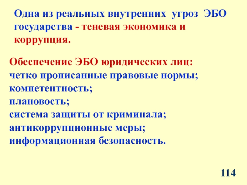 Слайд 114Одна из реальных внутренних угроз ЭБО государства - теневая экономика