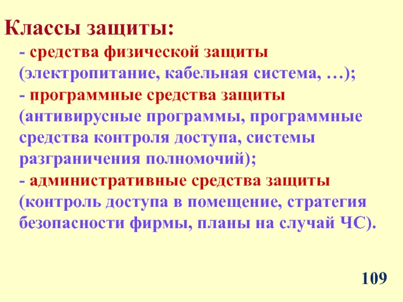 - средства физической защиты (электропитание, кабельная система, …); - программные средства защиты (антивирусные программы, программные средства контроля доступа, системы разграничения полномочий); - административные средства защиты (контроль доступа в помещение, стратегия безопасности фирмы, планы на случай ЧС).