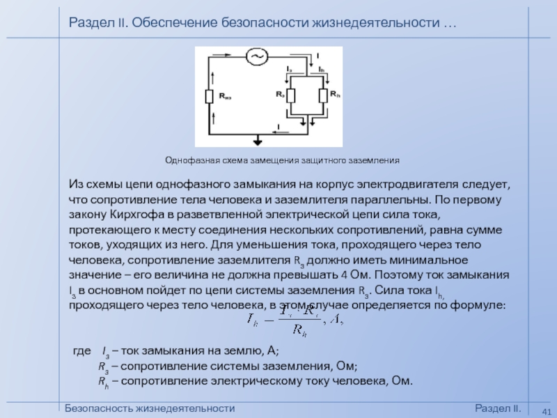 что сопротивление тела человека и заземлителя параллельны. По первому закону Кирхгофа в разветвленной электрической цепи сила тока, протекающего к месту соединения нескольких сопротивлений, равна сумме токов, уходящих из него. Для уменьшения тока, проходящего через тело человека, сопротивление заземлителя Rз должно иметь минимальное значение – его величина не должна превышать 4 Ом. Поэтому ток замыкания Iз в основном пойдет по цепи системы заземления Rз. Сила тока Ih, проходящего через тело человека, в этом случае определяется по формуле: