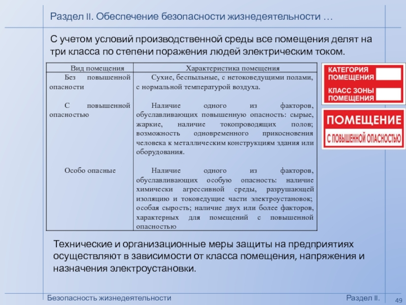 Технические и организационные меры защиты на предприятиях осуществляют в зависимости от класса помещения, напряжения и назначения электроустановки.