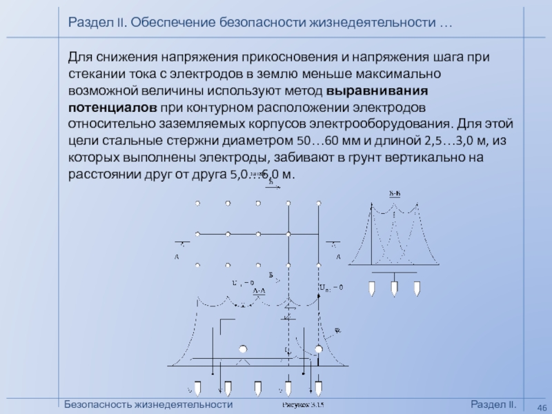 землю меньше максимально возможной величины используют метод выравнивания потенциалов при контурном расположении электродов относительно заземляемых корпусов электрооборудования. Для этой цели стальные стержни диаметром 50…60 мм и длиной 2,5…3,0 м, из которых выполнены электроды, забивают в грунт вертикально на расстоянии друг от друга 5,0…6,0 м.